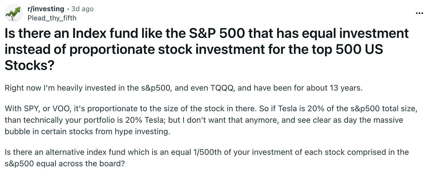 To answer plead_thy_fifth’s question: there are indeed a number of exchange-traded funds like this. They’re called equal-weight S&P 500 ETFs, and we’re looking at their pros and cons below.