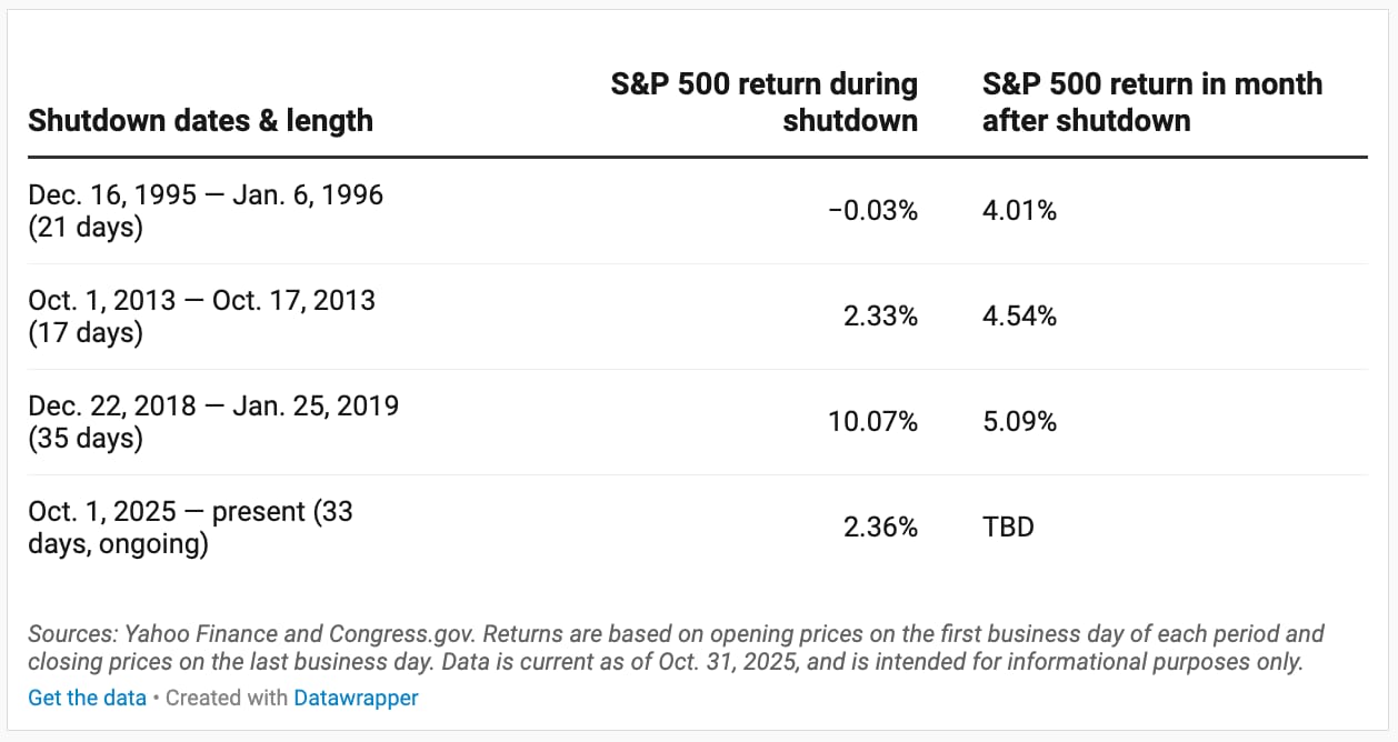 Of the three previous shutdowns that have lasted more than a week, two have had positive returns during the shutdown itself, and all three have had positive returns in the month after the shutdown.