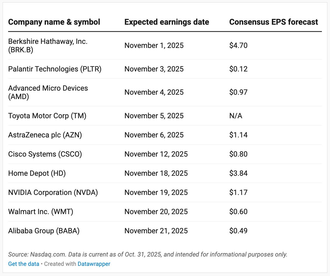 Below is a table of blue-chip stocks that are reporting earnings in November, with the expected dates and average analyst estimates for their upcoming earnings reports.