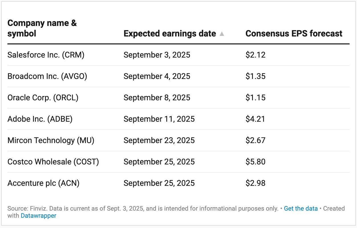 Below is a table of blue-chip stocks that are reporting earnings in September, with the expected dates and average analyst estimates for their upcoming earnings reports.