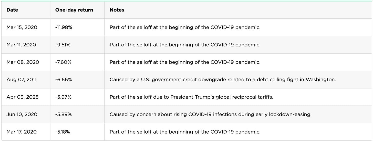 That COVID-19 crash also accounts for several of the largest one-day drops in the S&P 500 over the last 15 years. President Trump’s global tariffs caused one, as well.