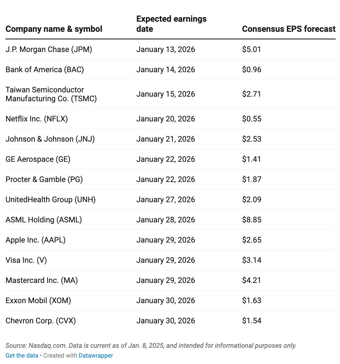 Below is a table of blue-chip stocks that are reporting earnings in January, with the expected dates and average analyst estimates for their upcoming earnings reports.